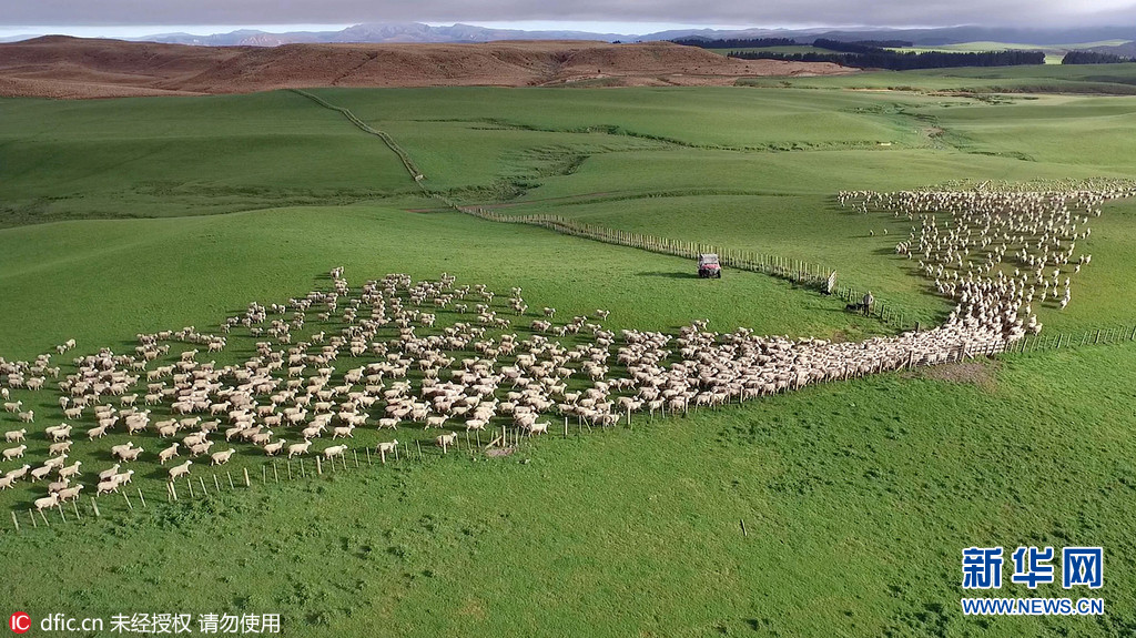 新西兰航拍摄影师惠特克(Tim Whittaker),近日在一个绿草如茵的牧场,用无人机从高空拍到大批绵羊放牧一幕。这些绵羊被猎狗追赶着迁移到新放牧地,过程中形成了千奇百怪的图案,场面极为震撼。图片来源:东方IC