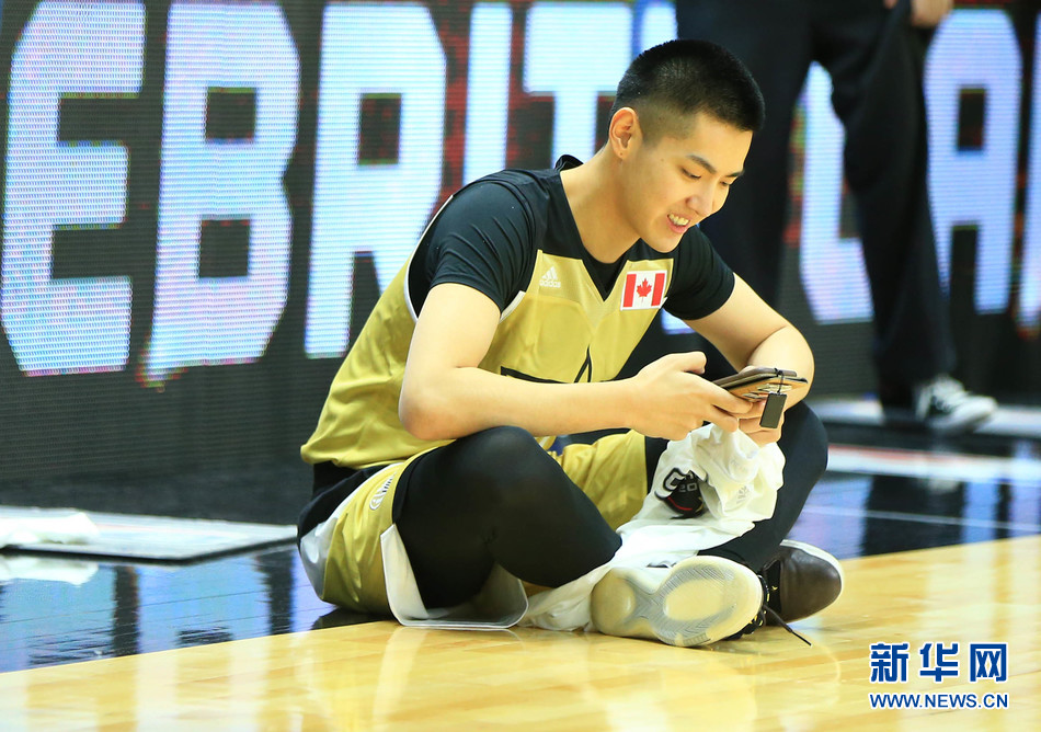 2月12日,吴亦凡在名人赛前毫不紧张,还不忘坐在地上玩会儿手机。新华网发(邹峥摄)