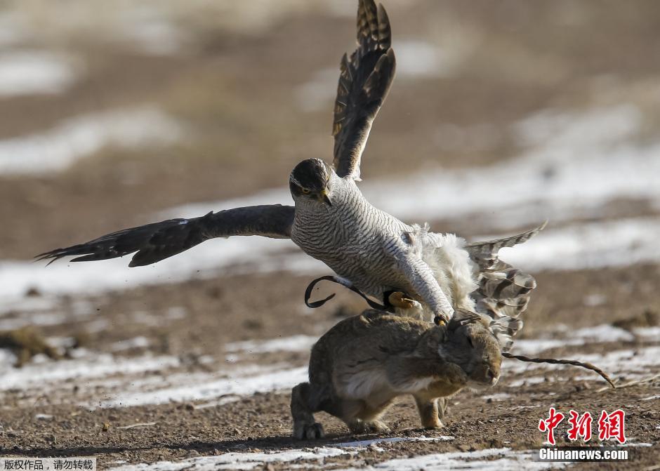 2月16日消息,哈萨克斯坦阿拉木图地区,哈萨克斯坦鹰猎人参加一年一度的狩猎比赛,参加狩猎比赛的鹰迅速捕捉地上的野兔。