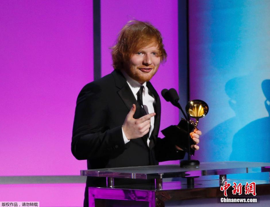 当地时间2月15日晚,第58届格莱美音乐奖的颁奖典礼在洛杉矶的斯台普斯中心举行,截至发稿,已有众多奖项出炉。图为Ed Sheeran获最佳流行歌手,他同时也获得了年度单曲奖。