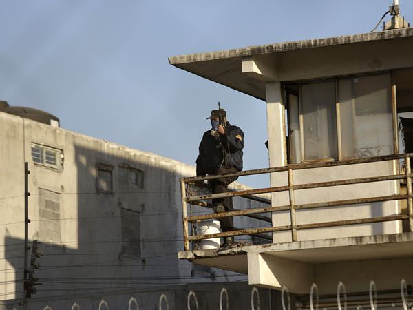 警察举枪站在岗楼上。(图片来源:新华/路透)