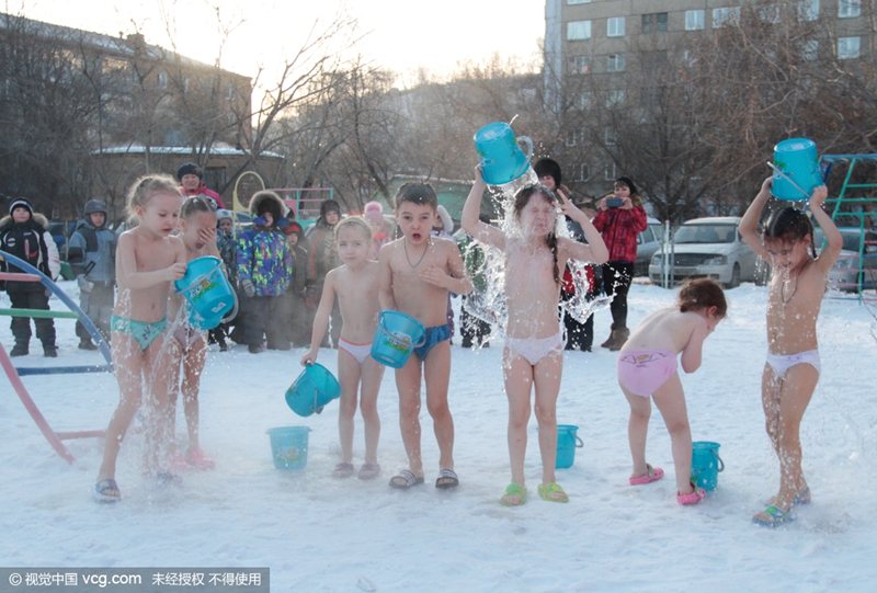 当地时间2016年2月16日,俄罗斯克拉斯诺雅茨克,Sibiryachok幼儿园的孩子们赤身慢跑并参加冰桶挑战。(rna/视觉中国)