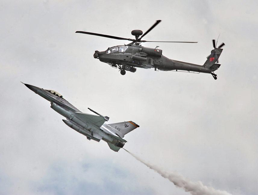 图为新加坡空军的AH-64D武直也与F-16战机进行编队飞行。