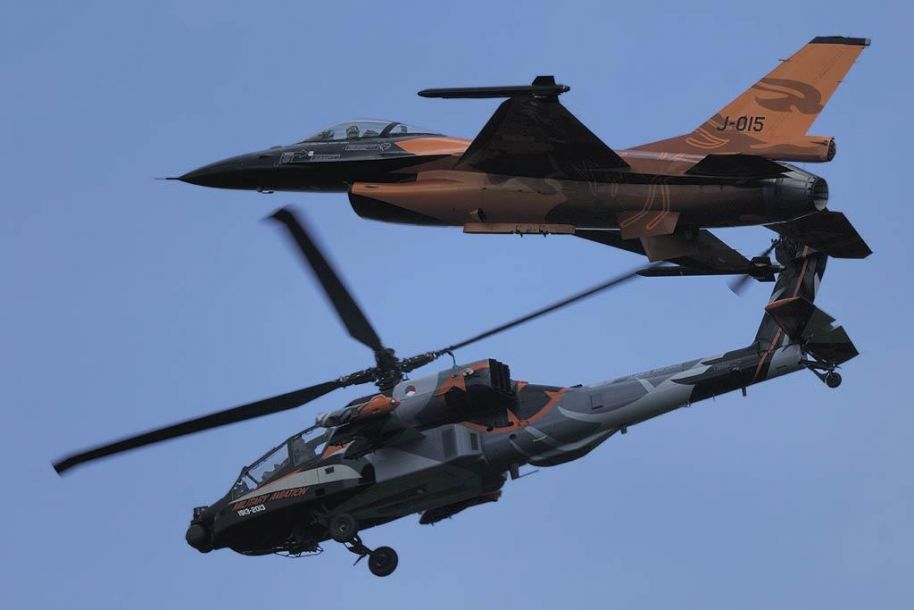 除新加坡空军外,荷兰空军也有一支由F-16AM战斗机和AH-64D武直组成的联合表演队,该队的表演也是颇具视觉冲击力。
