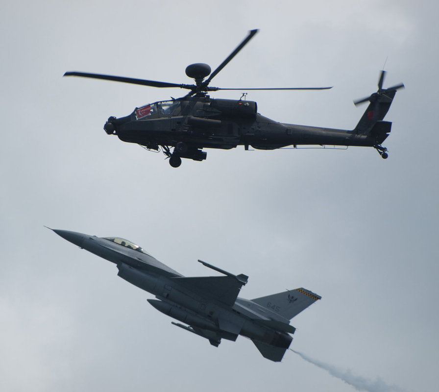图为新加坡空军的AH-64D武直也与F-16战机进行编队飞行。