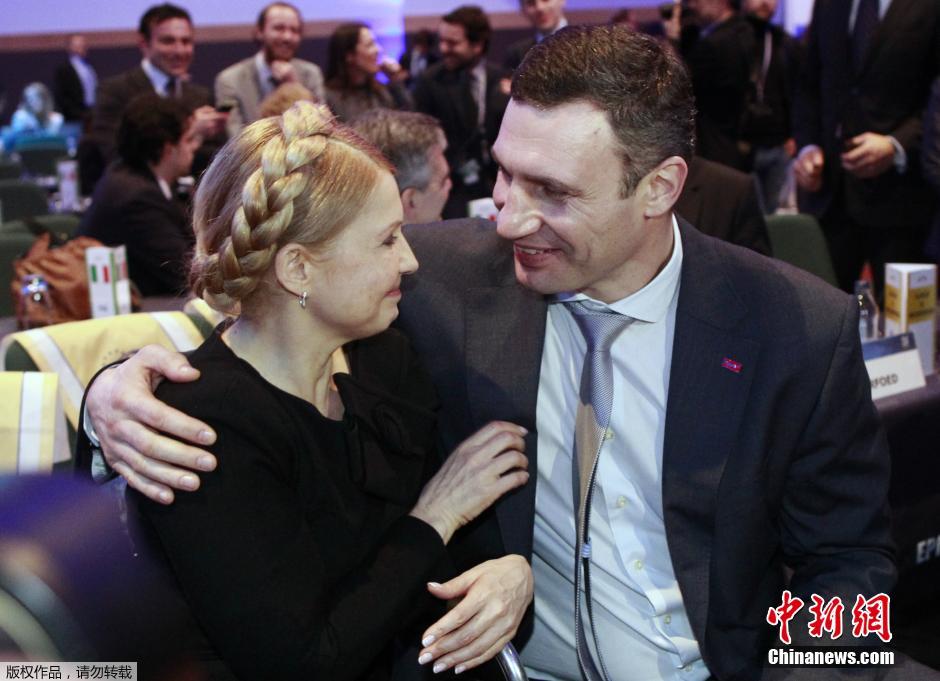 2014年3月6日,爱尔兰都柏林,刚被释放不久的乌克兰前总理季莫申科与乌克兰前拳王、反对派领导人克利钦科一起出席欧洲人民党选举大会,并一起亲密拥抱。当天,季莫申科梳着她那标志性的盘头发辫,容光焕发。