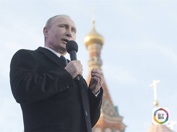 2015年3月18日,普京在莫斯科出席克里米亚入俄一周年庆祝活动时讲话。(新华社/法新)