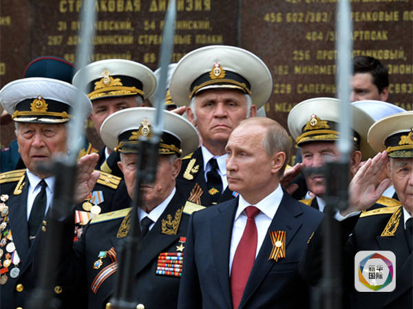 2014年5月9日,在克里米亚塞瓦斯托波尔港,普京(中)与二战老兵一起检阅仪仗队。这是克里米亚入俄后,普京首次抵达这一地区。(新华/法新)
