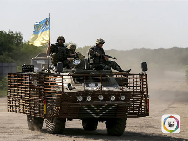 2015年6月4日,在乌克兰东部顿涅茨克州的阿尔乔莫夫斯克市,乌克兰政府军士兵乘坐军车巡逻。(新华社/路透)