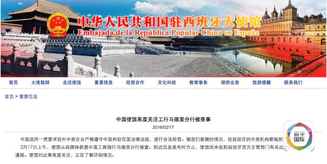 工行马德里分行遭搜查后,中国驻西班牙大使馆发表声明,对此事件表示高度关注。