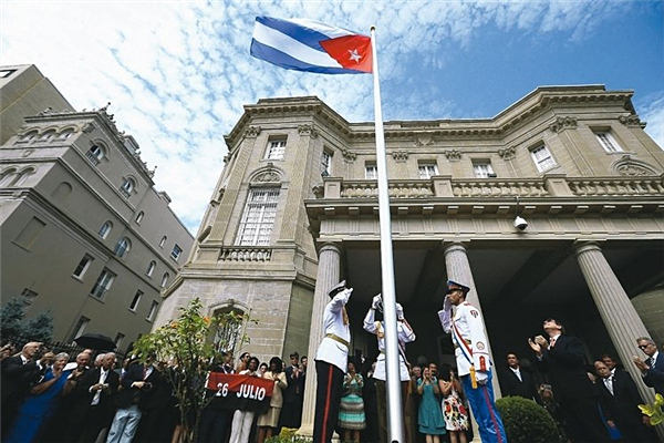 2015年7月20日,古巴驻华盛顿大使馆举行古巴国旗升旗仪式。自美国1961年与古巴断交后,古巴国旗首次在华府上空飘扬。 (法新社)