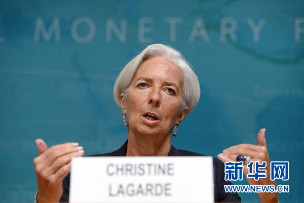 这是在美国首都华盛顿的国际货币基金组织(IMF)总部,IMF总裁拉加德在新闻发布会上讲话的资料照片(2014年6月16日摄)。新华社记者 殷博古 摄