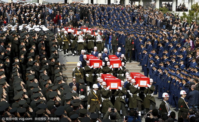 当地时间2016年2月19日,土耳其安卡拉,爆炸遇难者葬礼举行。2月17日,在土耳其首都安卡拉市中心红新月广场附近,救援车辆进入爆炸事发地。土耳其政府发言人17日说,土耳其首都安卡拉市中心红新月广场附近当天傍晚发生的汽车爆炸已造成至少28人死亡、61人受伤。(Reuters/视觉中国)