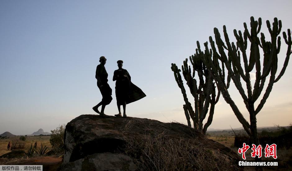 当地时间2月17日,乌干达东北山区的卡拉莫贾,两名原始部落的男子站在一处高地上。