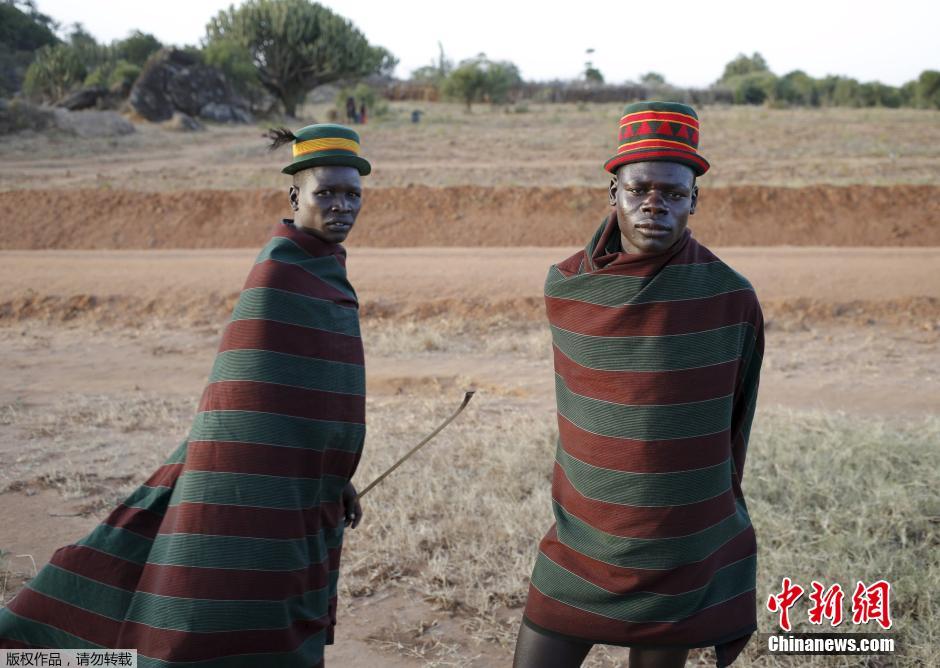 乌干达卡拉莫贾部落的男子穿着造型奇特的衣服,这里气候灼热,雨量稀少。