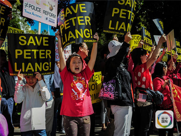 2月20日,在美国洛杉矶市政厅门前,民众参加集会声援梁彼得。(新华社记者张超群摄)