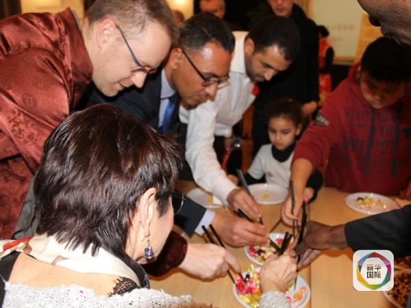 中国驻斯特拉斯堡总领馆在迎新春活动上,组织来宾学用筷子