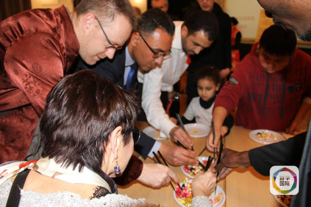 吸引来宾的还有现场互动体验,有绘画、书法、篆刻、剪纸、猜字、学用筷子、抽奖,还可以在轮盘上根据自己的出生年份找属相。不少来宾表示,今年的迎春会创意好,既融合又热烈。何彦军总领事向记者介绍说,为突出春节红火气氛,他们几个月前就开始策划,一个环节都不含糊。
