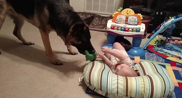 颇有默契的小宝宝立刻伸手抓玩具,不料弗雷娅轻轻一闪,让宝宝一手抓了空,就这样宝宝和牧羊犬玩起了“你来我往”的拔河游戏。视频中,宝宝乐得开怀大笑,还不住地蹬蹬双腿,而弗雷娅则一直温柔地逗着宝宝,场面温馨和谐。