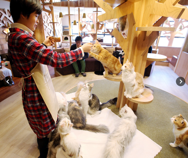 在暖烘烘的店内,猫们有的蜷缩在沙发上睡觉,有的悠闲地来回踱步,展现给我们优雅的身姿。其中有波斯猫、苏格兰折耳猫、美国短毛猫、越南猫等品种,约20只。
