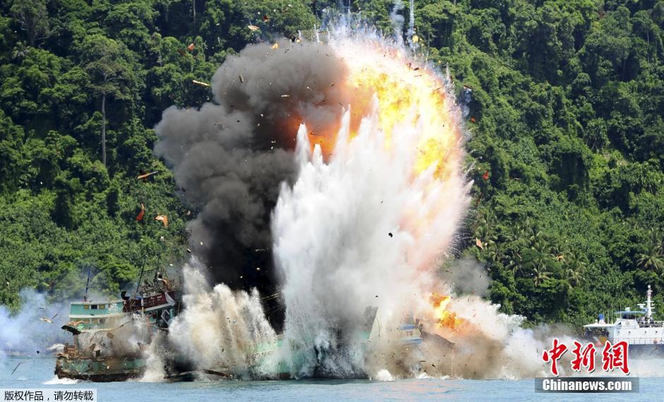 当地时间2016年2月22日,印度尼西亚22日在外海炸毁27艘外国渔船,展现捍卫经济海域的决心。 印度尼西亚渔业部长苏西(Susi Pudjiastuti)表示,今日炸毁渔船包括菲律宾、越南、马来西亚及缅甸船只。这些渔船都被发现进入印度尼西亚所属群岛内非法捕鱼。苏西说:“政府正采取更强悍的行动,确保我国海域安全。”