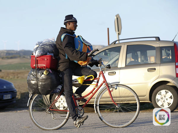 一名难民骑车满载大包小包的东西回到位于意大利西西里岛第二大城市卡塔尼亚以西70公里的米内欧难民收容中心。(新华社发)