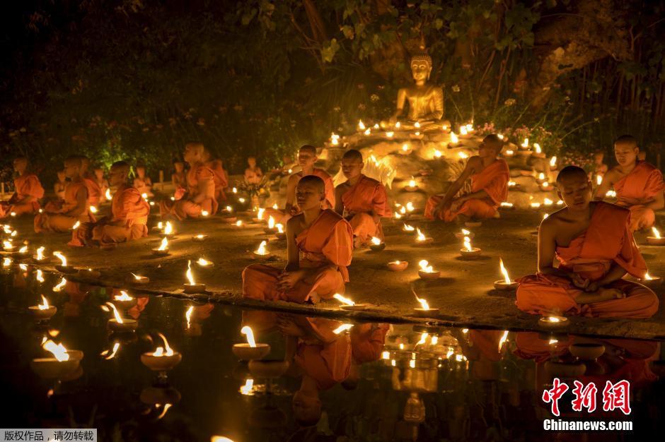 泰国庆祝万佛节 僧人打坐场面蔚为壮观(图)