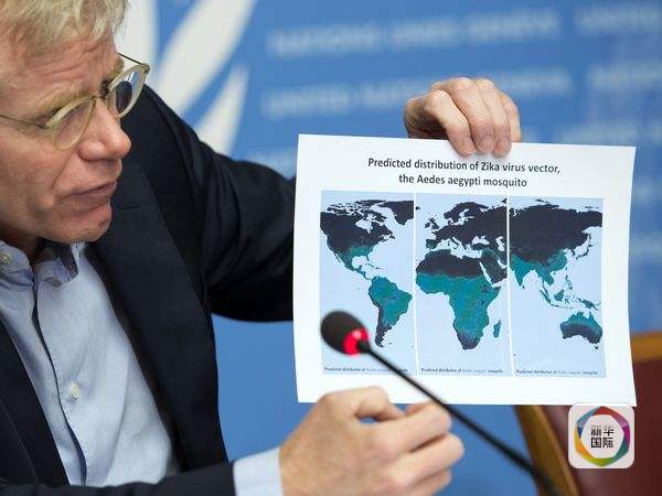 世界卫生组织官员在新闻会上展示寨卡传播预测图。(图片来源:新华/美联)