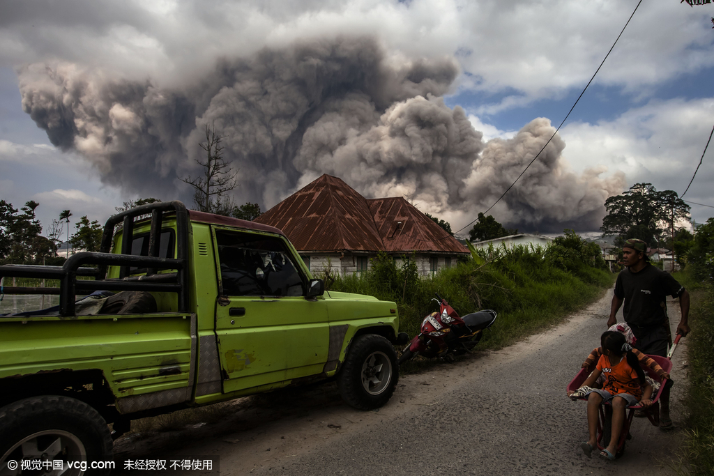 当地时间2016年2月24日,印尼北苏门答腊省Karo,锡纳朋火山喷发,当地媒体报道,火山附近12个村庄超过1万人离开家园搬到避难营地。