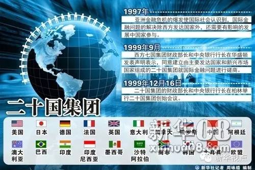 G20由主要发达国家和新兴市场国家组成,就国际金融问题进行磋商,成员除中国外,还包括美国、日本、德国、法国、英国、意大利、加拿大、俄罗斯,以及阿根廷、澳大利亚、巴西、印度、印度尼西亚、墨西哥、沙特阿拉伯、南非、韩国、土耳其和作为一个实体的欧盟。