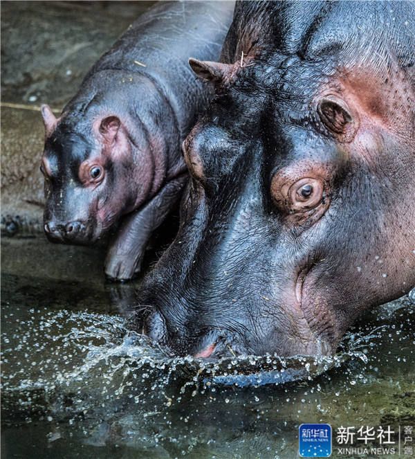 ↑2月26日,在捷克首都布拉格,一只一个月大的小河马和它的妈妈在喝水。这只小河马1月28日出生,还没有名字。新华社/欧新中文