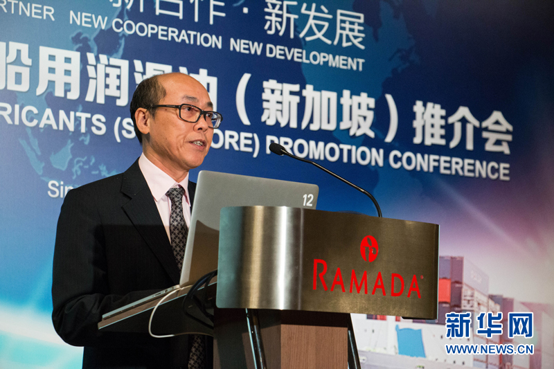 图为中国石化东南亚代表处总代表廖旭东致辞。中国石化(SINOPEC)船用润滑油推介会昨日下午在新加坡举行。推介会以“新伙伴、新合作、新发展”为主题,全面介绍SINOPEC船用润滑油在生产、保供和技术方面的实力,吸引众多海事行业人士参与。