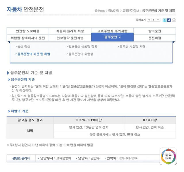 新华国际客户端在韩国道路交通公团网站上看到,韩国的酒驾标准也分为两级,检测出的血液酒精浓度达到0.05%以上是“醉酒状态”,酒精浓度超过0.1%属于“烂醉状态”,相当于普通成年男性饮用2杯半烧酒(或2听啤酒,2杯洋酒,2被葡萄酒)一小时以后的状态。两类酒驾的处罚标准轻重不一,血液酒精浓度在0.05%到0.1%之间时,会被刑事立案并处以100天禁止驾驶;酒精浓度超过0.1%会被刑事立案并吊销驾驶执照;而如果当事人不配合接受检测,一律按照烂醉处理。其中提到的刑事立案之后,可能被处以3年以下有期徒刑或1000万韩元(约合人民币6万元)以下罚款。