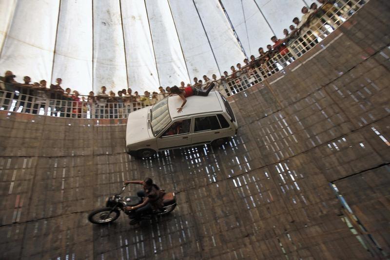 2011年9月29日,印度新德里,爱好者们驾驶汽车及摩托车表演特技“死亡之井”。