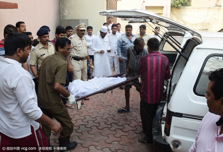 当地时间2016年2月28日,印度孟买,家庭聚会屠杀案遇难者葬礼举行。据法新社孟买消息,印度警方今天表示,1名35岁男子涉嫌以屠刀杀害包括7名孩童在内的14名亲人,随后上吊自杀。报道说,凶嫌与亲人27日晚在距离孟买32公里的塔那(Thane)家中团聚,聚会后发生惨案。