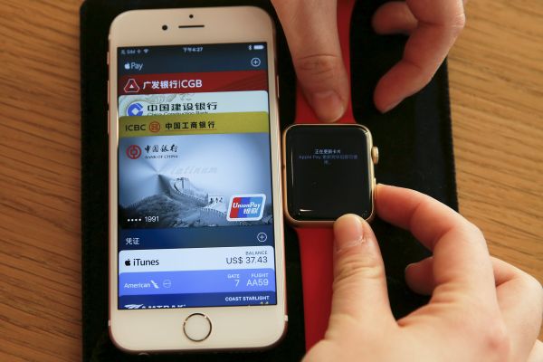 17日在北京的一家苹果专卖店里,工作人员在演示如何进行“苹果支付”。(路透社)