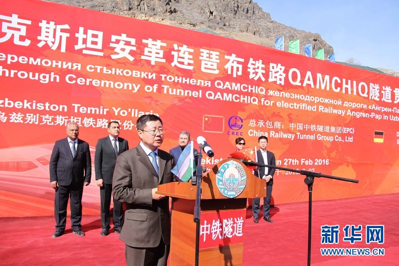 由中国政府优买项目、中铁隧道集团承担的乌兹别克斯坦安格连至帕普铁路卡姆奇克隧道27日在隧道出口举行全隧贯通剪彩仪式。当地时间27日上午10时,乌兹别克斯坦国家铁路公司主席拉马托夫、中国驻乌使馆孙立杰大使共同启动贯通爆破按钮,12时车队穿越全隧抵达隧道出口,举行了贯通剪彩仪式。