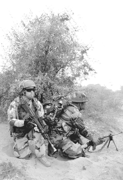 2016年1月16日,印度拉贾斯坦邦比卡内尔,法国和印度士兵举行联合军演。(人民视觉)