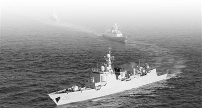 2015年10月14日,中国海军152舰艇编队在进行环球访问时,途经法国罗斯科夫以北海域时与法国海军举行联合演习。新华社发