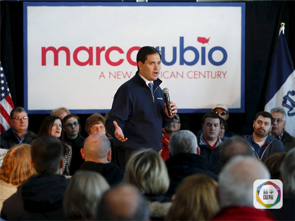 图为今年1月29日,在美国艾奥瓦州的马斯卡廷,共和党候选人马尔科·鲁比奥(中)在一场竞选活动中发表演说。