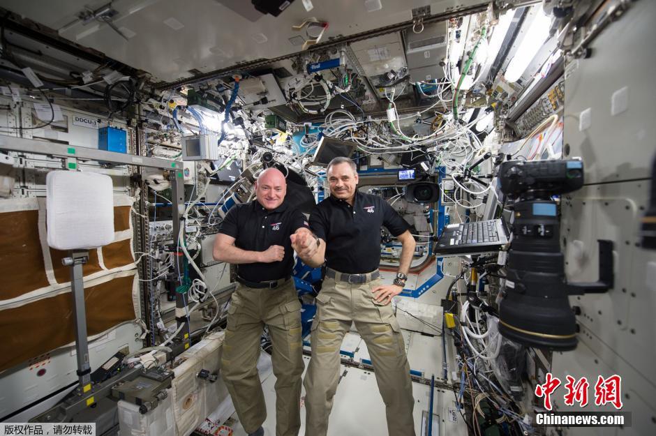 1月21日,斯科特·凯利(左)与米哈伊尔·科尔尼延科(右)在空间站内庆祝他们停留太空第300天。