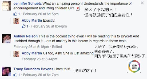 “你得到的分数会说明一些事,但不会说明所有。这些考试不能定义你。表现聪明有很多方式,你是聪明的,你已足够聪明!你是点亮我生活的那一道光,是我每天开心工作的原因。所以,在考试季的时候请记住,没有一种方式可以‘测试’你身上令人惊叹的品质。”