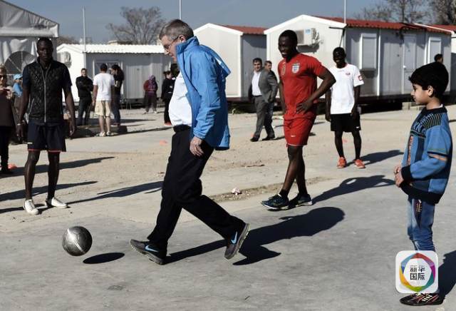 国际奥委会主席巴赫3日在雅典难民营踢球。