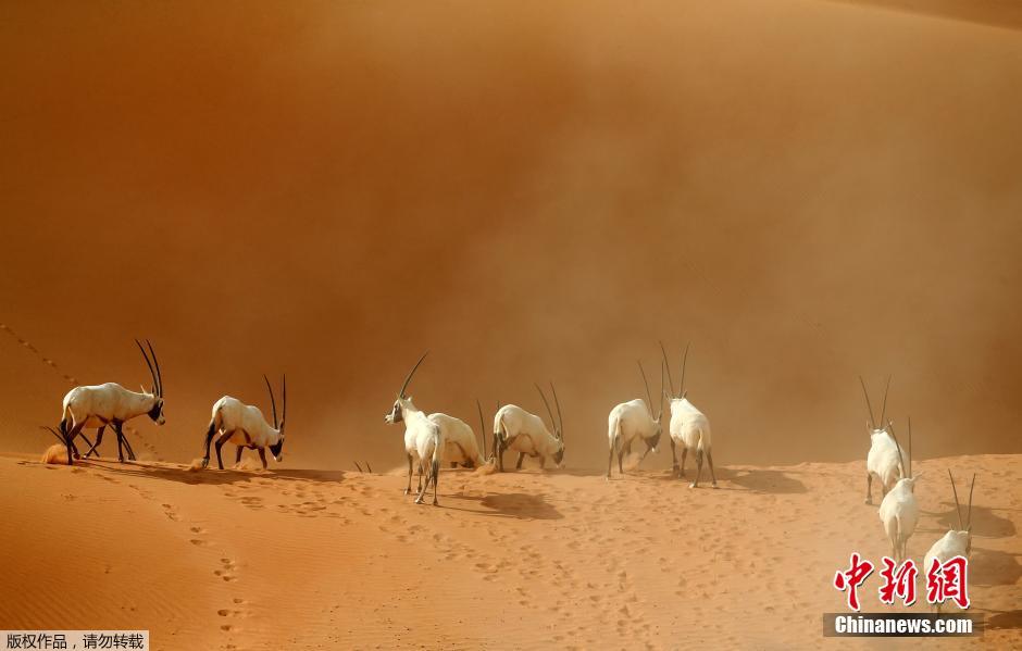 当地时间2016年3月1日,阿联酋Umm Al-Zamool,羚羊在阿拉伯羚羊保护区。阿拉伯羚羊保护区位于阿曼的中东沙漠及高山地区,占地约8900平方公里,目前生活着约155只阿拉伯大羚羊。