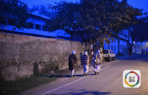 (在印度新德里附近的沃林达文,几名寡妇在日出前离开庇护所,走向一公里外的黑天神庙。新华社记者毕晓洋摄)