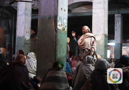 在印度新德里附近的沃林达文一所黑天神庙,一名寡妇领头呼唱颂神赞歌。每天每名寡妇可以参与上下午两场颂神仪式,共获得12卢比(约合人民币1.2元)的报酬。(新华社记者毕晓洋摄)