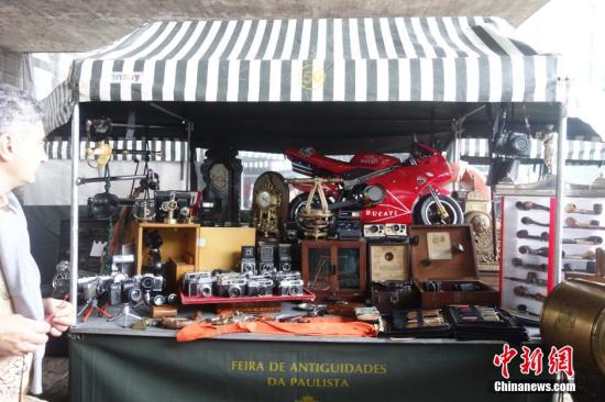 资料图:巴西圣保罗保利斯塔大街有一个周日古玩集市,只星期日开张,这里摆卖的古玩有瓷器、银器、灯饰、旧款相机、老款留声机、旧钟表等,品类繁多,吸引了众多顾客,生意红火。图为:一位顾客在一个旧款相机摊位前走过。 中新社记者 莫成雄 摄