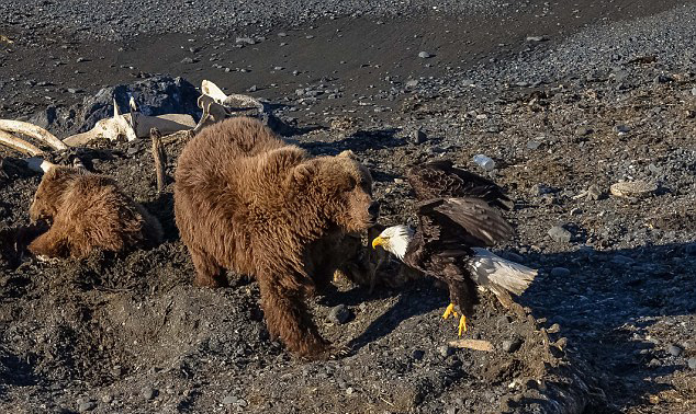 据英国《每日邮报》3月2日报道,在美国阿拉斯加州的科迪亚克岛上,一只母棕熊正带着小熊进食,这时飞来一只秃鹰想与之分食,却被棕熊一掌拍倒在地,奄奄一息。
