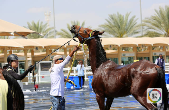 完成赛事后,中国骑手与养马员为马匹淋水降温。(新华社记者李震摄)