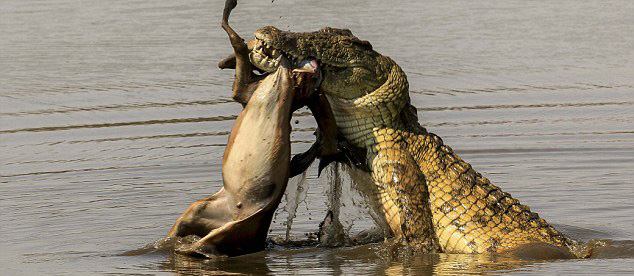 58岁的导游大卫 莫法特(David Moffat)当时带着游客游览该公园时,意外拍到了一组有趣的照片。这些照片显示,一头鳄鱼因为无法吞下猎物而被迫与同伴一起分享。起初,这只鳄鱼在河岸边将一只黑斑羚拖下水杀死,随后在空中甩动猎物以将其撕裂。然而经过多次尝试,猎物都没有被撕开,无奈之下,该鳄鱼只好爬上了岸与其它两个伙伴分享战利品。
